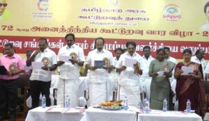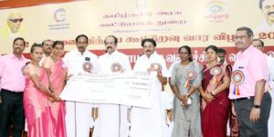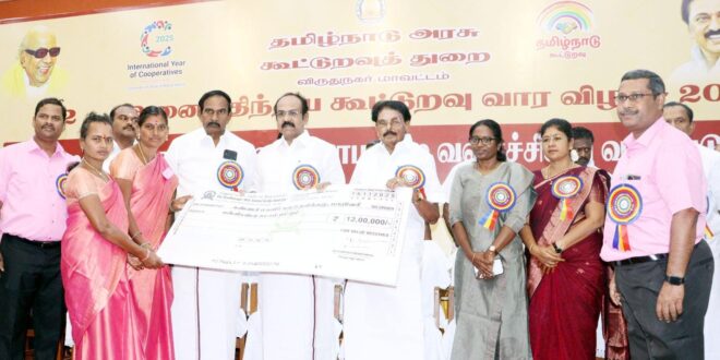 விருதுநகரில் 72 வது அனைத்திய கூட்டுறவு வாரவிழா மாவட்ட ஆட்சியர் சுகபுத்ரா தலைமையில் நடைபெற்றது.இவ்விழாவை மாநில வருவாய்த்துறை அமைச்சர் கே.கே.எஸ்.எஸ்.ஆர் இராமச்சந்திரன் மற்றும் நிதியமைச்சர் தங்கம் தென்னரசு ஆகியோர் குத்துவிளக்கேற்றி தொடங்கி வைத்து கூட்டுறவு வார விழா உறுதிமொழியை ஏற்றனர்.பின்னர் புதியவகை சிறுதானிய உணவுப் பொருட்களை அமைச்சர்கள் அறிமுகம் செய்தனர்.பின்னர் பல்வேறு சிறுவணிக கடன்,மத்தியகால கடன்,மகளிர் சுய உதவிக்கடன் என 21 திட்டங்கள் மூலம் 2 ஆயிரத்து 379 பயனாளிகளுக்கு ரூ.22 கோடியே 50 லட்சம் மதிப்பிலான கடன் தொகைக்கான காசோலைகளை வழங்கினார்.