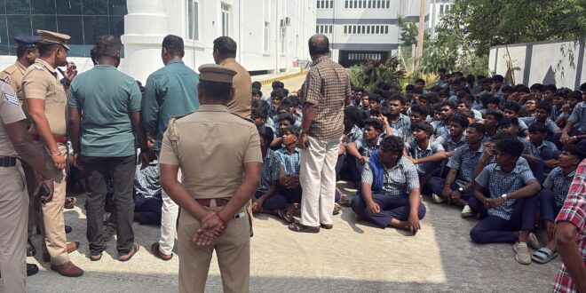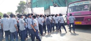 திருப்பூர் ராயபுரம் பகுதியில் நஞ்சப்பா அரசு ஆண்கள் மேல்நிலைப்பள்ளி செயல்பட்டு வருகிறது. இதில் 6ம் வகுப்பு முதல் 12ம் வகுப்பு வரை சுமார் 2,000க்கும் மேற்பட்ட மாணவர்கள் கல்வி பயின்று வருகின்றனர். மிகவும் பழமையான பள்ளி என்பதால் திருப்பூர் மாநகரின் சுற்றுவட்டார பகுதிகளில் இருந்து ஏராளமான மாணவர்கள் பேருந்து மூலம் இங்கு வந்து கல்வி பயின்று வருகின்றனர். இந்த நிலையில் 10 மற்றும் 12ம் வகுப்பு மாணவர்களுக்கு பொதுத்தேர்வு விரைவில் வரக்கூடிய சூழலில் அவர்களுக்கு சிறப்பு வகுப்புகள் எடுக்கப்பட்டு வருகிறது. இந்த நிலையில் நேற்று 10 மற்றும் 12ம் வகுப்பு மாணவர்களுக்கான சிறப்பு வகுப்பு நடந்தது. இரவு 7 மணி வரை இந்த சிறப்பு வகுப்புகள் நடைபெற்றதால், மாநகரின் பல்வேறு பகுதிகளுக்கு செல்லக்கூடிய மாணவர்கள் பேருந்துகள் இன்றி மிகவும் சிரமப்பட்டனர். வீடுகளுக்கு செல்லவே இரவு 8 மணிக்கு மேல் ஆனதாகவும் அதன் காரணமாக இன்று காலை பள்ளிக்கு வருவதற்கு தாமதம் ஏற்பட்டுள்ளது. இதனிடையே இன்று தாமதமாக பள்ளிக்கு வந்த மாணவர்களை ஆசிரியர் மற்றும் தலைமை ஆசிரியர் பள்ளிக்கு தாமதமாக வந்தது குறித்து கேள்வி எழுப்பியதுடன் தரக்குறைவான வார்த்தைகளில் திட்டியதாக கூறப்படுகிறது இதனால் ஆத்திரமடைந்த மாணவர்கள் நூற்றுக்கும் மேற்பட்டோர் திருப்பூர் ரயில் நிலையம் அருகே சாலை மறியல் போராட்டத்தில் ஈடுபட்டனர் இதனால் அங்கு சிறிது நேரம் போக்குவரத்து பாதிப்பு ஏற்பட்டது இதனை தொடர்ந்து சம்பவ இடத்திற்கு வந்த போலீசார் மாணவர்களுடன் பேச்சுவார்த்தை நடத்தி அவர்களை அங்கிருந்து அப்புறப்படுத்தினர். தொடர்ந்து மாணவர்களை டவுன்ஹால் வளாகத்திற்கு அழைத்துச் சென்று பேச்சுவார்த்தை நடத்தி வருகின்றனர். மாணவர்களின் இந்த திடீர் சாலை மறியல் போராட்டத்தால் அப்பகுதியில் சிறிது நேரம் பரபரப்பு நிலவியது.