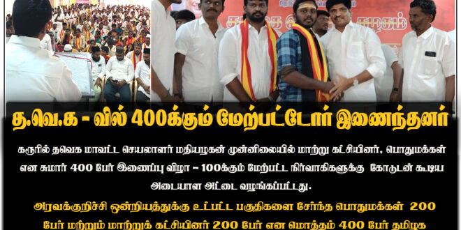 கரூரில் தவெக மாவட்ட செயலாளர் மதியழகன் முன்னிலையில் மாற்று கட்சியினர், பொதுமக்கள் என சுமார் 400 பேர் இணைப்பு விழா – 100க்கும் மேற்பட்ட நிர்வாகிகளுக்கு QR கோடுடன் கூடிய அடையாள அட்டை வழங்கப்பட்டது.