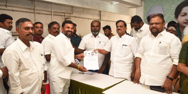 ஆற்காடு தொகுதிக்கு அதிமுக சார்பில் போட்டியிட அக்கட்சியின் புரட்சித்தலைவி அம்மா பேரவை மாநில துணை செயலாளர் டாக்டர் ஜோதிக்குமார் விருப்ப மனுவினை அக்கட்சித்தலைமை அலுவலகத்தில் தாக்கல் செய்தார்