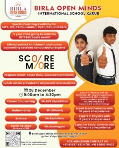 கரூர் BIRLA OPENMINDS INTERNATIONAL SCHOOL ல் சி.பி.எஸ்.இ பத்தாம் வகுப்பு பயிலும் மாணவர்களுக்கான ‘ஸ்கோர் மோர்’ என்னும் நிகழ்ச்சி 28.12.2025 மற்றும் 04.01.2026 ஆகிய தேதிகளில் காலை 9.30 மணிமுதல் மாலை 4.30 மணி வரை நடைபெறுகிறது. இந்நிகழ்ச்சியில் பத்தாம் வகுப்பிற்கு பிறகு என்ன படிக்கலாம் என்று விளக்கும் வகையிலும் பத்தாம் வகுப்பில் கணிதம், அறிவியல், சமூக அறிவியல் பாடங்களில் உயர் மதிப்பெண் பெறுவது எவ்வாறு என்பது குறித்த கல்வி வழிகாட்டி நிகழ்ச்சி எவ்வித கட்டணமும் இல்லாமல் மாணவர்களின் நலனைக் கருத்தில் கொண்டு முதன் முதலாக கரூரில் நடத்த திட்டமிடப்பட்டுள்ளது.
